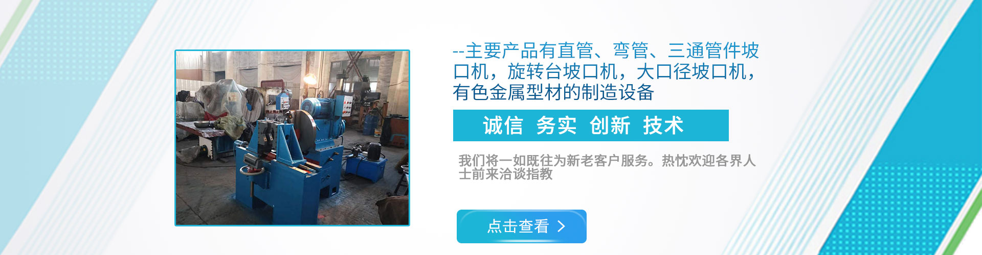 公司現(xiàn)下轄兩個分廠,一分廠主營電動管道坡口機和焊接設(shè)備,適用于造船、電力工程安裝、石油、化工、鍋爐廠、冶金以及鋼鐵行業(yè); 二分廠主營雙頭坡口機,600mm直管坡口機和金屬型材擠壓生產(chǎn)線,適用于銅、鋁、鎂、鉛、鋅等有色金屬及其合金的加工。